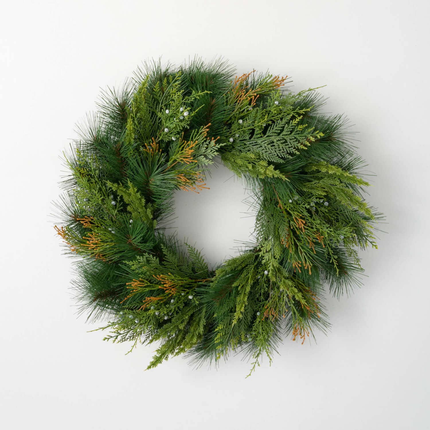 A clever mixture of lush pines is paired beautifully with juniper & berries to create this wintery classic. At 24" across, you can use this decorative wreath anywhere in the home. Bring color & texture to any space with this classic style. This collection will be a joy to design with each season.